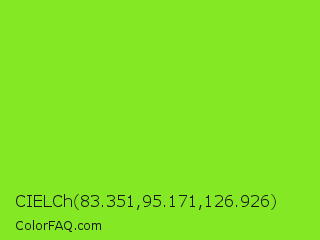CIELCh 83.351,95.171,126.926 Color is a normal green color and the nearest color is Spring Frost #87ff2a. Hex code #85e824 and RGB value is rgb(133,232,36). In RGB color space, this color is composed of 52% red, 91% green, 14% blue, In CMYK color space, this color is composed of 43% cyan, 0% magenta, 84% yellow , 9% black , In HSL color space, this color has a hue angle of 90° , 81% saturation and 53% lightness.