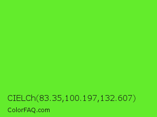 CIELCh 83.35,100.197,132.607 Color is a normal green color and the nearest color is Spring Frost #87ff2a. Hex code #63ec2c and RGB value is rgb(99,236,44). In RGB color space, this color is composed of 39% red, 93% green, 17% blue, In CMYK color space, this color is composed of 58% cyan, 0% magenta, 81% yellow , 7% black , In HSL color space, this color has a hue angle of 103° , 83% saturation and 55% lightness.