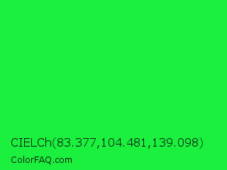 CIELCh 83.377,104.481,139.098 Color is a normal green color and the nearest color is Malachite #0bda51. Hex code #1af03d and RGB value is rgb(26,240,61). In RGB color space, this color is composed of 10% red, 94% green, 24% blue, In CMYK color space, this color is composed of 89% cyan, 0% magenta, 75% yellow , 6% black , In HSL color space, this color has a hue angle of 130° , 88% saturation and 52% lightness.