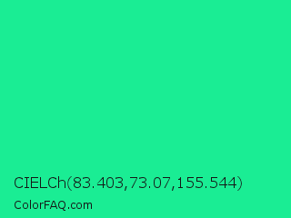CIELCh 83.403,73.07,155.544 Color is a normal green color and the nearest color is Medium Spring Green #00fa9a. Hex code #1aed94 and RGB value is rgb(26,237,148). In RGB color space, this color is composed of 10% red, 93% green, 58% blue, In CMYK color space, this color is composed of 89% cyan, 0% magenta, 38% yellow , 7% black , In HSL color space, this color has a hue angle of 155° , 85% saturation and 52% lightness.