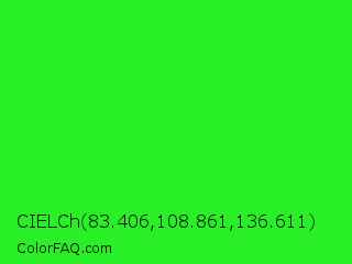 CIELCh 83.406,108.861,136.611 Color is a normal green color and the nearest color is Neon Green #39ff14. Hex code #29f026 and RGB value is rgb(41,240,38). In RGB color space, this color is composed of 16% red, 94% green, 15% blue, In CMYK color space, this color is composed of 83% cyan, 0% magenta, 84% yellow , 6% black , In HSL color space, this color has a hue angle of 119° , 87% saturation and 55% lightness.