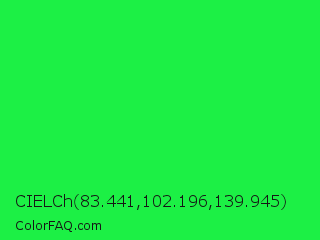 CIELCh 83.441,102.196,139.945 Color is a normal green color and the nearest color is Malachite #0bda51. Hex code #1cf045 and RGB value is rgb(28,240,69). In RGB color space, this color is composed of 11% red, 94% green, 27% blue, In CMYK color space, this color is composed of 88% cyan, 0% magenta, 71% yellow , 6% black , In HSL color space, this color has a hue angle of 132° , 88% saturation and 53% lightness.