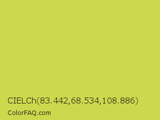 CIELCh 83.442,68.534,108.886 Color is a normal yellow color and the nearest color is Wattle #dcd747. Hex code #ccd94d and RGB value is rgb(204,217,77). In RGB color space, this color is composed of 80% red, 85% green, 30% blue, In CMYK color space, this color is composed of 6% cyan, 0% magenta, 65% yellow , 15% black , In HSL color space, this color has a hue angle of 66° , 65% saturation and 58% lightness.