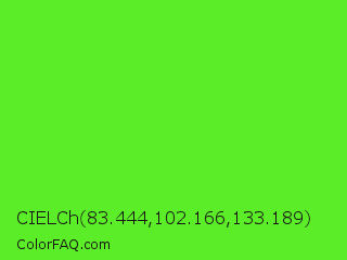 CIELCh 83.444,102.166,133.189 Color is a normal green color and the nearest color is Harlequin Green #46cb18. Hex code #5ced29 and RGB value is rgb(92,237,41). In RGB color space, this color is composed of 36% red, 93% green, 16% blue, In CMYK color space, this color is composed of 61% cyan, 0% magenta, 83% yellow , 7% black , In HSL color space, this color has a hue angle of 104° , 84% saturation and 55% lightness.