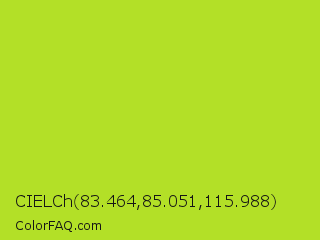 CIELCh 83.464,85.051,115.988 Color is a normal lime color and the nearest color is Inch Worm #b0e313. Hex code #b3e027 and RGB value is rgb(179,224,39). In RGB color space, this color is composed of 70% red, 88% green, 15% blue, In CMYK color space, this color is composed of 20% cyan, 0% magenta, 83% yellow , 12% black , In HSL color space, this color has a hue angle of 75° , 75% saturation and 52% lightness.
