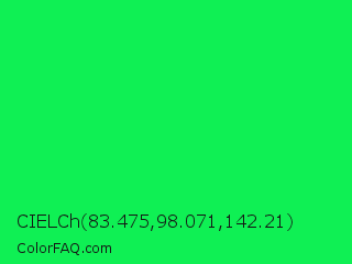 CIELCh 83.475,98.071,142.21 Color is a normal green color and the nearest color is Malachite #0bda51. Hex code #0ff054 and RGB value is rgb(15,240,84). In RGB color space, this color is composed of 6% red, 94% green, 33% blue, In CMYK color space, this color is composed of 94% cyan, 0% magenta, 65% yellow , 6% black , In HSL color space, this color has a hue angle of 138° , 88% saturation and 50% lightness.