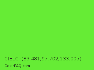 CIELCh 83.481,97.702,133.005 Color is a normal green color and the nearest color is Spring Frost #87ff2a. Hex code #66ec35 and RGB value is rgb(102,236,53). In RGB color space, this color is composed of 40% red, 93% green, 21% blue, In CMYK color space, this color is composed of 57% cyan, 0% magenta, 78% yellow , 7% black , In HSL color space, this color has a hue angle of 104° , 83% saturation and 57% lightness.