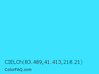 CIELCh 83.489,41.413,218.21 Color is a light cyan color and the nearest color is Loeen #15f2fd. Hex code #3be3ff and RGB value is rgb(59,227,255). In RGB color space, this color is composed of 23% red, 89% green, 100% blue, In CMYK color space, this color is composed of 77% cyan, 11% magenta, 0% yellow , 0% black , In HSL color space, this color has a hue angle of 189° , 100% saturation and 62% lightness.