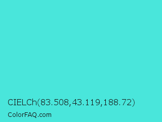 CIELCh 83.508,43.119,188.72 Color is a normal cyan color and the nearest color is Turquoise #40e0d0. Hex code #49e6db and RGB value is rgb(73,230,219). In RGB color space, this color is composed of 29% red, 90% green, 86% blue, In CMYK color space, this color is composed of 68% cyan, 0% magenta, 5% yellow , 10% black , In HSL color space, this color has a hue angle of 176° , 76% saturation and 59% lightness.