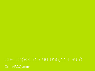 CIELCh 83.513,90.056,114.395 Color is a normal lime color and the nearest color is Fuego #bede0d. Hex code #b5e000 and RGB value is rgb(181,224,0). In RGB color space, this color is composed of 71% red, 88% green, 0% blue, In CMYK color space, this color is composed of 19% cyan, 0% magenta, 100% yellow , 12% black , In HSL color space, this color has a hue angle of 72° , 100% saturation and 44% lightness.