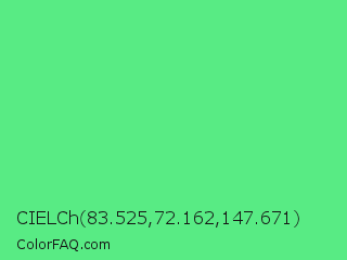 CIELCh 83.525,72.162,147.671 Color is a light green color and the nearest color is Very Light Malachite Green #64e986. Hex code #58eb84 and RGB value is rgb(88,235,132). In RGB color space, this color is composed of 35% red, 92% green, 52% blue, In CMYK color space, this color is composed of 63% cyan, 0% magenta, 44% yellow , 8% black , In HSL color space, this color has a hue angle of 138° , 79% saturation and 63% lightness.
