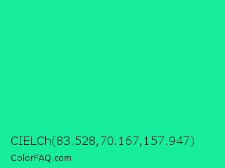 CIELCh 83.528,70.167,157.947 Color is a normal green color and the nearest color is Medium Spring Green #00fa9a. Hex code #18ed9c and RGB value is rgb(24,237,156). In RGB color space, this color is composed of 9% red, 93% green, 61% blue, In CMYK color space, this color is composed of 90% cyan, 0% magenta, 34% yellow , 7% black , In HSL color space, this color has a hue angle of 157° , 86% saturation and 51% lightness.