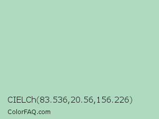 CIELCh 83.536,20.56,156.226 Color is a light green color and the nearest color is Fringy Flower #b1e2c1. Hex code #b0dac0 and RGB value is rgb(176,218,192). In RGB color space, this color is composed of 69% red, 85% green, 75% blue, In CMYK color space, this color is composed of 19% cyan, 0% magenta, 12% yellow , 15% black , In HSL color space, this color has a hue angle of 143° , 36% saturation and 77% lightness.