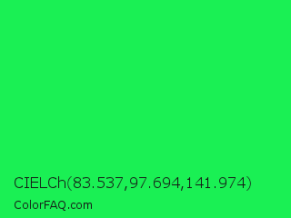 CIELCh 83.537,97.694,141.974 Color is a normal green color and the nearest color is Malachite #0bda51. Hex code #1af054 and RGB value is rgb(26,240,84). In RGB color space, this color is composed of 10% red, 94% green, 33% blue, In CMYK color space, this color is composed of 89% cyan, 0% magenta, 65% yellow , 6% black , In HSL color space, this color has a hue angle of 136° , 88% saturation and 52% lightness.