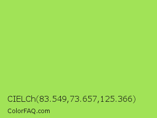 CIELCh 83.549,73.657,125.366 Color is a light green color and the nearest color is Conifer #acdd4d. Hex code #a1e357 and RGB value is rgb(161,227,87). In RGB color space, this color is composed of 63% red, 89% green, 34% blue, In CMYK color space, this color is composed of 29% cyan, 0% magenta, 62% yellow , 11% black , In HSL color space, this color has a hue angle of 88° , 71% saturation and 62% lightness.