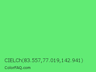 CIELCh 83.557,77.019,142.941 Color is a light green color and the nearest color is Very Light Malachite Green #64e986. Hex code #61eb74 and RGB value is rgb(97,235,116). In RGB color space, this color is composed of 38% red, 92% green, 45% blue, In CMYK color space, this color is composed of 59% cyan, 0% magenta, 51% yellow , 8% black , In HSL color space, this color has a hue angle of 128° , 78% saturation and 65% lightness.
