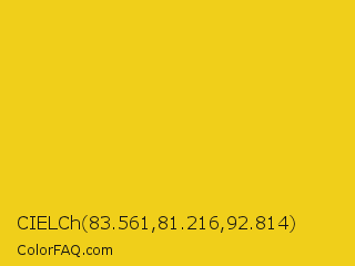 CIELCh 83.561,81.216,92.814 Color is a normal yellow color and the nearest color is Jonquil #f4ca16. Hex code #f0cf1a and RGB value is rgb(240,207,26). In RGB color space, this color is composed of 94% red, 81% green, 10% blue, In CMYK color space, this color is composed of 0% cyan, 14% magenta, 89% yellow , 6% black , In HSL color space, this color has a hue angle of 51° , 88% saturation and 52% lightness.