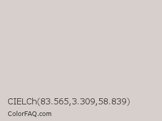 CIELCh 83.565,3.309,58.839 Color is a very light orange color and the nearest color is Celeste #d1d2ca. Hex code #d6cfcb and RGB value is rgb(214,207,203). In RGB color space, this color is composed of 84% red, 81% green, 80% blue, In CMYK color space, this color is composed of 0% cyan, 3% magenta, 5% yellow , 16% black , In HSL color space, this color has a hue angle of 22° , 12% saturation and 82% lightness.