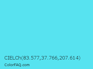 CIELCh 83.577,37.766,207.614 Color is a light cyan color and the nearest color is Turquoise Blue #6cdae7. Hex code #57e3f0 and RGB value is rgb(87,227,240). In RGB color space, this color is composed of 34% red, 89% green, 94% blue, In CMYK color space, this color is composed of 64% cyan, 5% magenta, 0% yellow , 6% black , In HSL color space, this color has a hue angle of 185° , 84% saturation and 64% lightness.