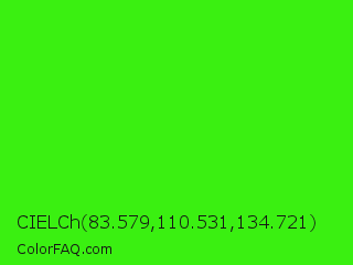 CIELCh 83.579,110.531,134.721 Color is a normal green color and the nearest color is Neon Green #39ff14. Hex code #3af011 and RGB value is rgb(58,240,17). In RGB color space, this color is composed of 23% red, 94% green, 7% blue, In CMYK color space, this color is composed of 76% cyan, 0% magenta, 93% yellow , 6% black , In HSL color space, this color has a hue angle of 109° , 88% saturation and 50% lightness.