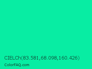 CIELCh 83.581,68.098,160.426 Color is a normal green color and the nearest color is Medium Spring Green #00fa9a. Hex code #08eda3 and RGB value is rgb(8,237,163). In RGB color space, this color is composed of 3% red, 93% green, 64% blue, In CMYK color space, this color is composed of 97% cyan, 0% magenta, 31% yellow , 7% black , In HSL color space, this color has a hue angle of 161° , 93% saturation and 48% lightness.