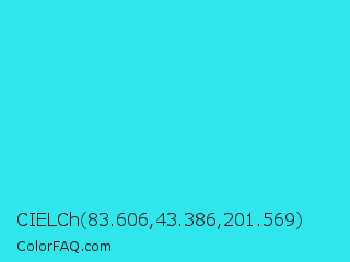 CIELCh 83.606,43.386,201.569 Color is a normal cyan color and the nearest color is Loeen #15f2fd. Hex code #2fe6ed and RGB value is rgb(47,230,237). In RGB color space, this color is composed of 18% red, 90% green, 93% blue, In CMYK color space, this color is composed of 80% cyan, 3% magenta, 0% yellow , 7% black , In HSL color space, this color has a hue angle of 182° , 84% saturation and 56% lightness.