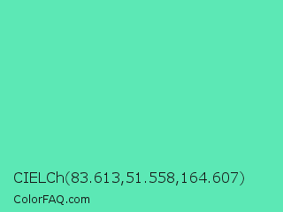 CIELCh 83.613,51.558,164.607 Color is a light green color and the nearest color is Medium Aquamarine #66ddaa. Hex code #5ce8b5 and RGB value is rgb(92,232,181). In RGB color space, this color is composed of 36% red, 91% green, 71% blue, In CMYK color space, this color is composed of 60% cyan, 0% magenta, 22% yellow , 9% black , In HSL color space, this color has a hue angle of 158° , 75% saturation and 64% lightness.