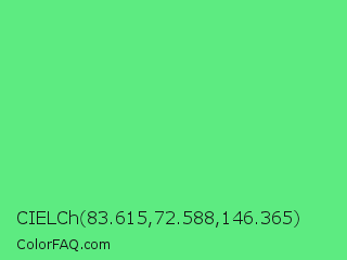 CIELCh 83.615,72.588,146.365 Color is a light green color and the nearest color is Very Light Malachite Green #64e986. Hex code #5deb81 and RGB value is rgb(93,235,129). In RGB color space, this color is composed of 36% red, 92% green, 51% blue, In CMYK color space, this color is composed of 60% cyan, 0% magenta, 45% yellow , 8% black , In HSL color space, this color has a hue angle of 135° , 78% saturation and 64% lightness.