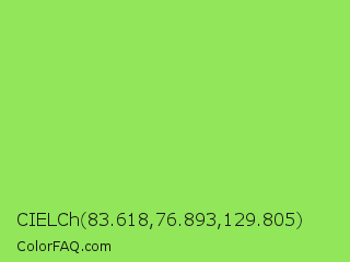 CIELCh 83.618,76.893,129.805 Color is a light green color and the nearest color is Kiwi #8ee53f. Hex code #91e659 and RGB value is rgb(145,230,89). In RGB color space, this color is composed of 57% red, 90% green, 35% blue, In CMYK color space, this color is composed of 37% cyan, 0% magenta, 61% yellow , 10% black , In HSL color space, this color has a hue angle of 96° , 74% saturation and 63% lightness.