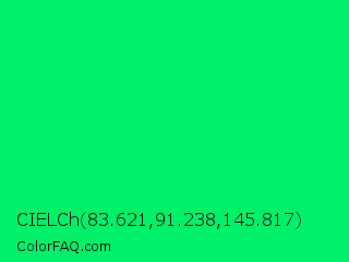 CIELCh 83.621,91.238,145.817 Color is a normal green color and the nearest color is Spring Green #00ff7f. Hex code #00f069 and RGB value is rgb(0,240,105). In RGB color space, this color is composed of 0% red, 94% green, 41% blue, In CMYK color space, this color is composed of 100% cyan, 0% magenta, 56% yellow , 6% black , In HSL color space, this color has a hue angle of 146° , 100% saturation and 47% lightness.