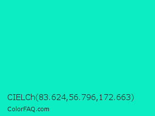 CIELCh 83.624,56.796,172.663 Color is a normal cyan color and the nearest color is Bright Turquoise #08e8de. Hex code #0cebc1 and RGB value is rgb(12,235,193). In RGB color space, this color is composed of 5% red, 92% green, 76% blue, In CMYK color space, this color is composed of 95% cyan, 0% magenta, 18% yellow , 8% black , In HSL color space, this color has a hue angle of 169° , 90% saturation and 48% lightness.