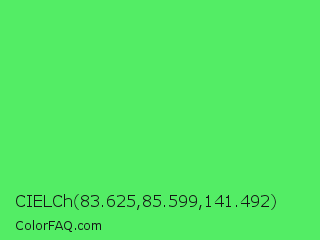 CIELCh 83.625,85.599,141.492 Color is a light green color and the nearest color is Screamin Green #66ff66. Hex code #53ed65 and RGB value is rgb(83,237,101). In RGB color space, this color is composed of 33% red, 93% green, 40% blue, In CMYK color space, this color is composed of 65% cyan, 0% magenta, 57% yellow , 7% black , In HSL color space, this color has a hue angle of 127° , 81% saturation and 63% lightness.