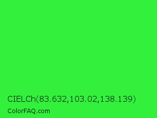 CIELCh 83.632,103.02,138.139 Color is a normal green color and the nearest color is Lime Green #32cd32. Hex code #33f03d and RGB value is rgb(51,240,61). In RGB color space, this color is composed of 20% red, 94% green, 24% blue, In CMYK color space, this color is composed of 79% cyan, 0% magenta, 75% yellow , 6% black , In HSL color space, this color has a hue angle of 123° , 86% saturation and 57% lightness.
