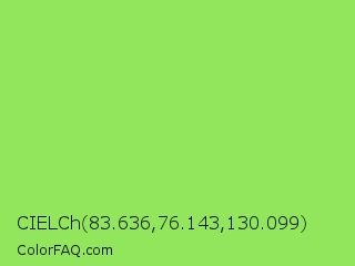 CIELCh 83.636,76.143,130.099 Color is a light green color and the nearest color is Kiwi #8ee53f. Hex code #91e65b and RGB value is rgb(145,230,91). In RGB color space, this color is composed of 57% red, 90% green, 36% blue, In CMYK color space, this color is composed of 37% cyan, 0% magenta, 60% yellow , 10% black , In HSL color space, this color has a hue angle of 97° , 74% saturation and 63% lightness.