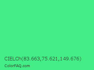 CIELCh 83.663,75.621,149.676 Color is a normal green color and the nearest color is Very Light Malachite Green #64e986. Hex code #42ed85 and RGB value is rgb(66,237,133). In RGB color space, this color is composed of 26% red, 93% green, 52% blue, In CMYK color space, this color is composed of 72% cyan, 0% magenta, 44% yellow , 7% black , In HSL color space, this color has a hue angle of 144° , 83% saturation and 59% lightness.