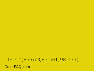 CIELCh 83.673,83.681,98.433 Color is a normal yellow color and the nearest color is Citrine #e4d00a. Hex code #e3d40a and RGB value is rgb(227,212,10). In RGB color space, this color is composed of 89% red, 83% green, 4% blue, In CMYK color space, this color is composed of 0% cyan, 7% magenta, 96% yellow , 11% black , In HSL color space, this color has a hue angle of 56° , 92% saturation and 46% lightness.