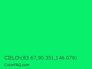 CIELCh 83.67,90.351,146.079 Color is a normal green color and the nearest color is Spring Green #00ff7f. Hex code #08f06b and RGB value is rgb(8,240,107). In RGB color space, this color is composed of 3% red, 94% green, 42% blue, In CMYK color space, this color is composed of 97% cyan, 0% magenta, 55% yellow , 6% black , In HSL color space, this color has a hue angle of 146° , 94% saturation and 49% lightness.