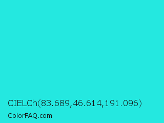 CIELCh 83.689,46.614,191.096 Color is a normal cyan color and the nearest color is Bright Turquoise #08e8de. Hex code #24e8e0 and RGB value is rgb(36,232,224). In RGB color space, this color is composed of 14% red, 91% green, 88% blue, In CMYK color space, this color is composed of 84% cyan, 0% magenta, 3% yellow , 9% black , In HSL color space, this color has a hue angle of 178° , 81% saturation and 53% lightness.