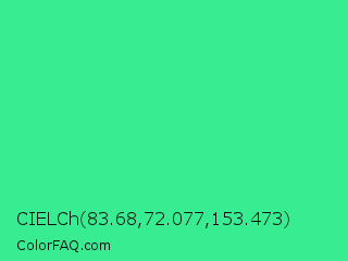 CIELCh 83.68,72.077,153.473 Color is a normal green color and the nearest color is Eucalyptus #44d7a8. Hex code #38ed91 and RGB value is rgb(56,237,145). In RGB color space, this color is composed of 22% red, 93% green, 57% blue, In CMYK color space, this color is composed of 76% cyan, 0% magenta, 39% yellow , 7% black , In HSL color space, this color has a hue angle of 150° , 83% saturation and 57% lightness.