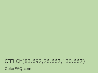 CIELCh 83.692,26.667,130.667 Color is a light green color and the nearest color is Sprout #c1d7b0. Hex code #bed9aa and RGB value is rgb(190,217,170). In RGB color space, this color is composed of 75% red, 85% green, 67% blue, In CMYK color space, this color is composed of 12% cyan, 0% magenta, 22% yellow , 15% black , In HSL color space, this color has a hue angle of 94° , 38% saturation and 76% lightness.