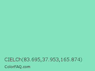 CIELCh 83.695,37.953,165.874 Color is a light green color and the nearest color is Pearl Aqua #88d8c0. Hex code #83e3be and RGB value is rgb(131,227,190). In RGB color space, this color is composed of 51% red, 89% green, 75% blue, In CMYK color space, this color is composed of 42% cyan, 0% magenta, 16% yellow , 11% black , In HSL color space, this color has a hue angle of 157° , 63% saturation and 70% lightness.