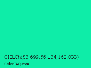 CIELCh 83.699,66.134,162.033 Color is a normal green color and the nearest color is Medium Spring Green #00fa9a. Hex code #0eeda8 and RGB value is rgb(14,237,168). In RGB color space, this color is composed of 5% red, 93% green, 66% blue, In CMYK color space, this color is composed of 94% cyan, 0% magenta, 29% yellow , 7% black , In HSL color space, this color has a hue angle of 161° , 89% saturation and 49% lightness.