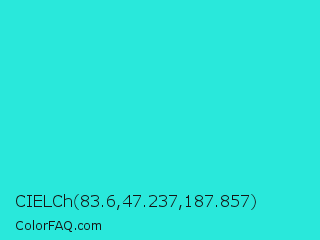 CIELCh 83.6,47.237,187.857 Color is a normal cyan color and the nearest color is Turquoise #40e0d0. Hex code #29e8db and RGB value is rgb(41,232,219). In RGB color space, this color is composed of 16% red, 91% green, 86% blue, In CMYK color space, this color is composed of 82% cyan, 0% magenta, 6% yellow , 9% black , In HSL color space, this color has a hue angle of 176° , 81% saturation and 54% lightness.