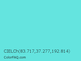 CIELCh 83.717,37.277,192.814 Color is a light cyan color and the nearest color is Turquoise Blue #6cdae7. Hex code #64e4df and RGB value is rgb(100,228,223). In RGB color space, this color is composed of 39% red, 89% green, 87% blue, In CMYK color space, this color is composed of 56% cyan, 0% magenta, 2% yellow , 11% black , In HSL color space, this color has a hue angle of 178° , 70% saturation and 64% lightness.