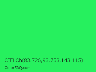 CIELCh 83.726,93.753,143.115 Color is a normal green color and the nearest color is Malachite #0bda51. Hex code #26f05e and RGB value is rgb(38,240,94). In RGB color space, this color is composed of 15% red, 94% green, 37% blue, In CMYK color space, this color is composed of 84% cyan, 0% magenta, 61% yellow , 6% black , In HSL color space, this color has a hue angle of 137° , 87% saturation and 55% lightness.