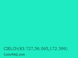CIELCh 83.727,56.065,172.399 Color is a normal cyan color and the nearest color is Turquoise PWG #30d5c8. Hex code #1eebc1 and RGB value is rgb(30,235,193). In RGB color space, this color is composed of 12% red, 92% green, 76% blue, In CMYK color space, this color is composed of 87% cyan, 0% magenta, 18% yellow , 8% black , In HSL color space, this color has a hue angle of 168° , 84% saturation and 52% lightness.