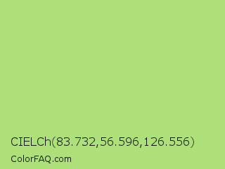 CIELCh 83.732,56.596,126.556 Color is a light green color and the nearest color is Yellow Green #c5e17a. Hex code #ade078 and RGB value is rgb(173,224,120). In RGB color space, this color is composed of 68% red, 88% green, 47% blue, In CMYK color space, this color is composed of 23% cyan, 0% magenta, 46% yellow , 12% black , In HSL color space, this color has a hue angle of 89° , 63% saturation and 67% lightness.