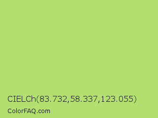 CIELCh 83.732,58.337,123.055 Color is a light green color and the nearest color is Yellow Green #c5e17a. Hex code #b3df71 and RGB value is rgb(179,223,113). In RGB color space, this color is composed of 70% red, 87% green, 44% blue, In CMYK color space, this color is composed of 20% cyan, 0% magenta, 49% yellow , 13% black , In HSL color space, this color has a hue angle of 84° , 63% saturation and 66% lightness.