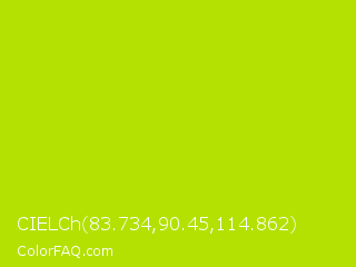 CIELCh 83.734,90.45,114.862 Color is a normal lime color and the nearest color is Fuego #bede0d. Hex code #b4e101 and RGB value is rgb(180,225,1). In RGB color space, this color is composed of 71% red, 88% green, 0% blue, In CMYK color space, this color is composed of 20% cyan, 0% magenta, 100% yellow , 12% black , In HSL color space, this color has a hue angle of 72° , 99% saturation and 44% lightness.