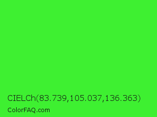 CIELCh 83.739,105.037,136.363 Color is a normal green color and the nearest color is Neon Green #39ff14. Hex code #3ef031 and RGB value is rgb(62,240,49). In RGB color space, this color is composed of 24% red, 94% green, 19% blue, In CMYK color space, this color is composed of 74% cyan, 0% magenta, 80% yellow , 6% black , In HSL color space, this color has a hue angle of 116° , 86% saturation and 57% lightness.